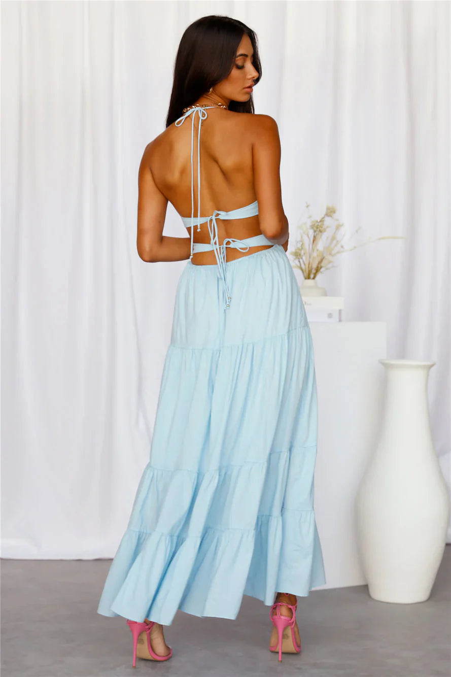 Girl Where aren't you beautiful? Especially in this fun midi which features a tie-up halterneck, a sweetheart neckline, an open back with a flowy skirt. Style yours with mules and waves.