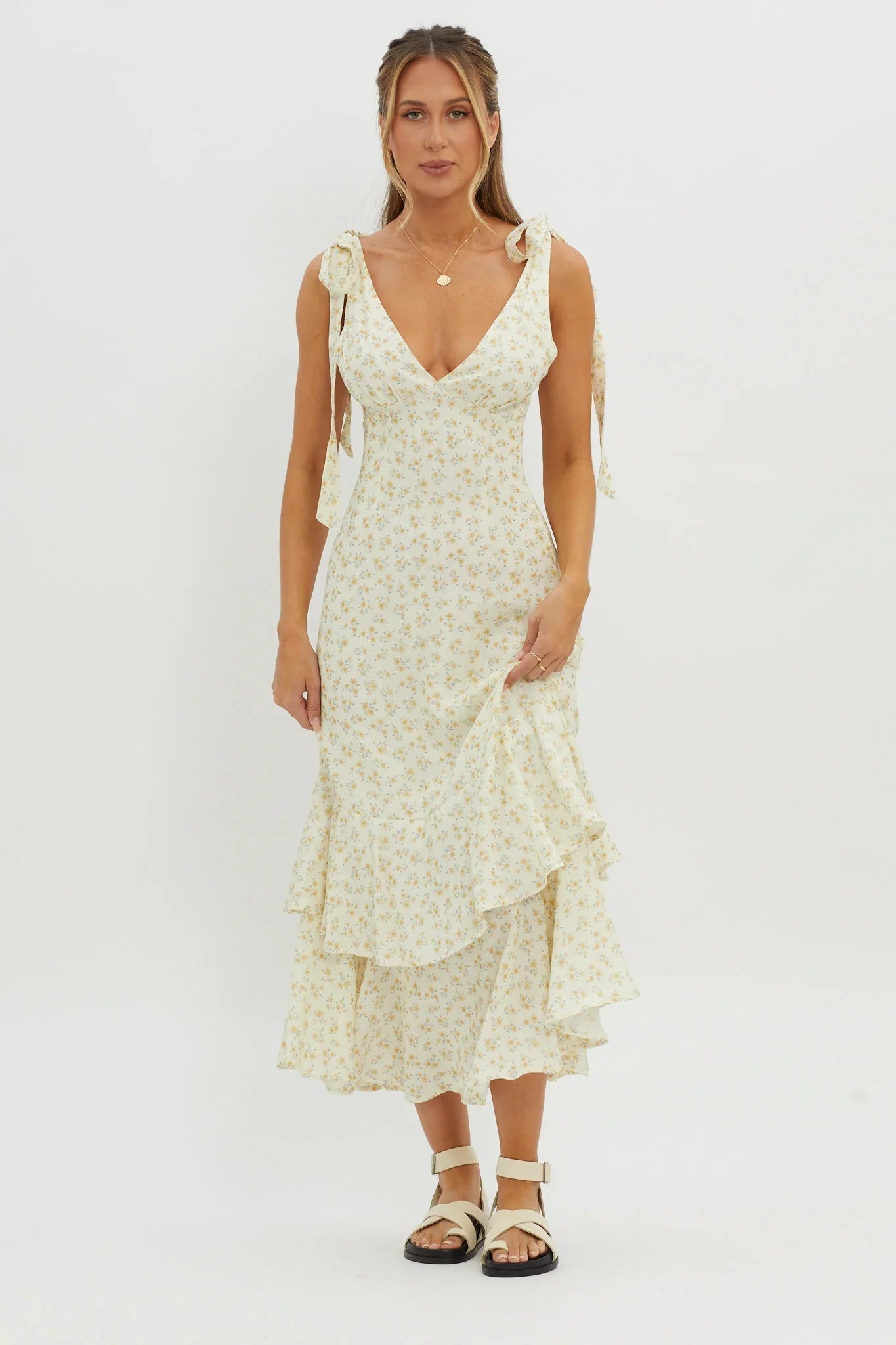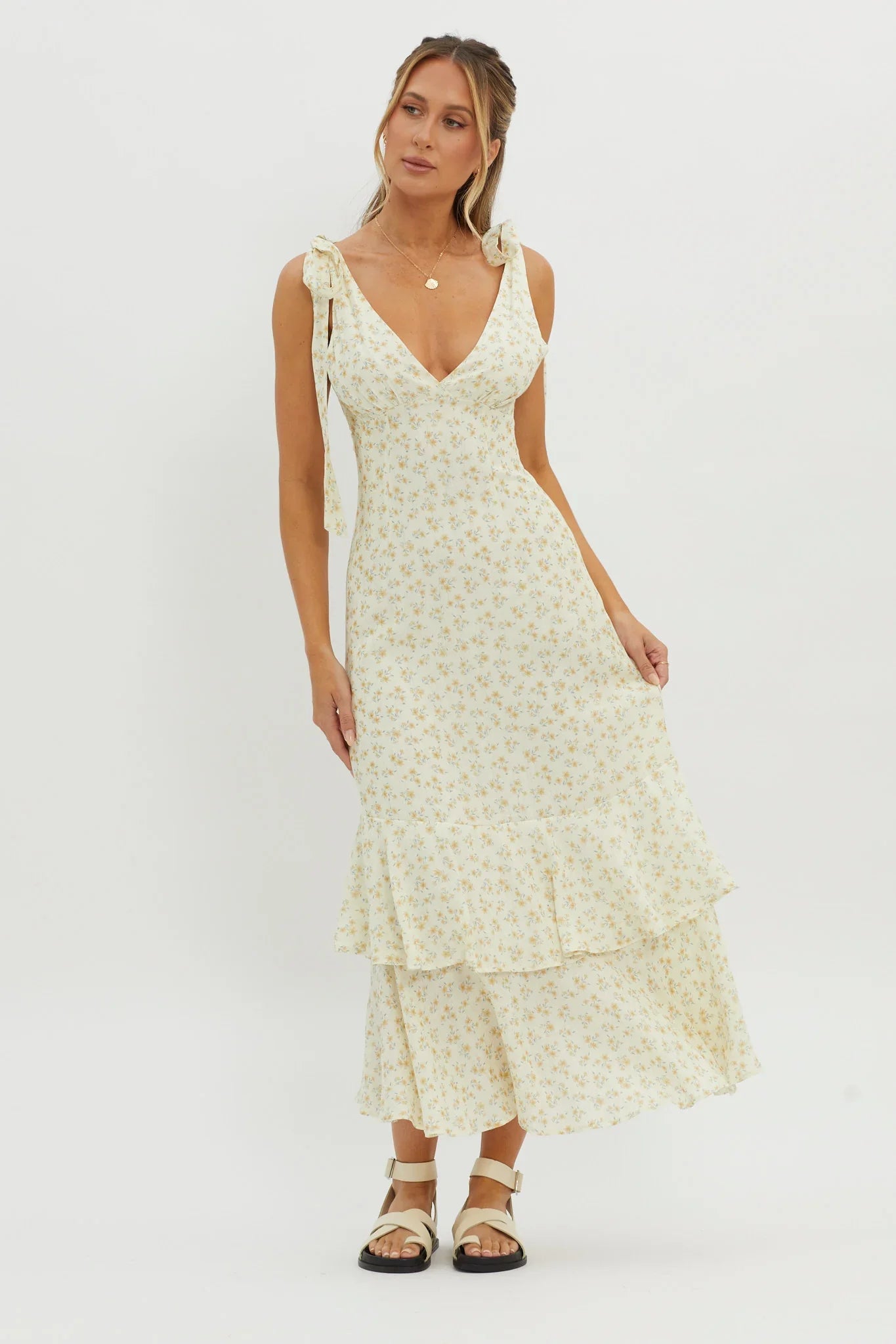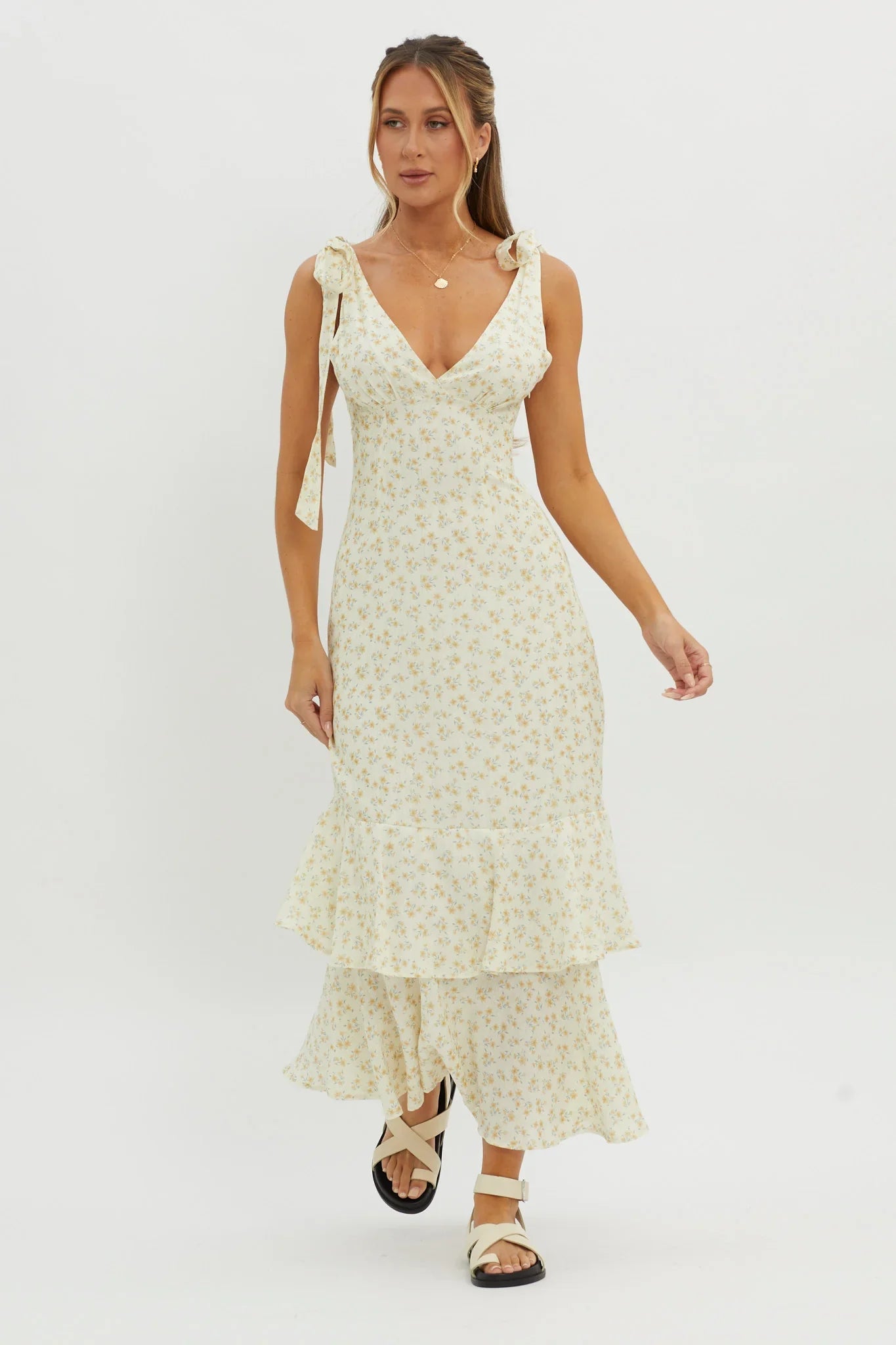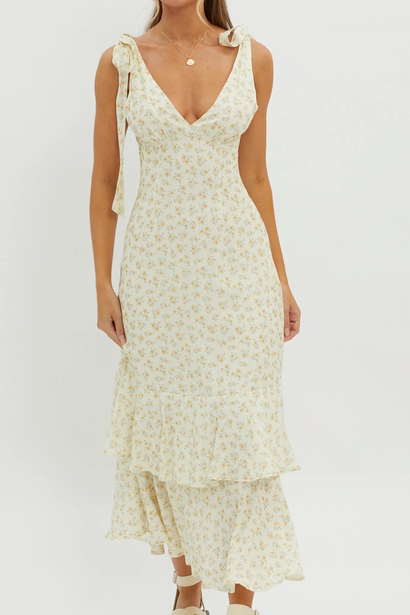 We've fallen head over heels for our dreamy Manhattan Summer maxi dress. Featuring tied shoulders and a wide ruffle trim in the hem; you'll be flooded with compliments! Perfect for a wedding or romantic date with your crush. Team it with white, tie-up heels and a saddle bag for a gorgeous look.